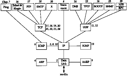 (Numerous fine points are missing from this figure that will be discussed in the appropriate chapter. For example, both the DNS and RPC use TCP, which we don't show.)