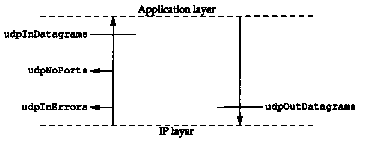 What this diagram shows is that the number of UDP datagrams delivered to applications (udpInDatagrams) is the number of UDP datagrams delivered from IP to UDP, minus udpInErrors, minus udpNoPorts. Also, the number of UDP datagrams delivered to IP (udpOutDatagrams) is the number passed to UDP from the applications. This illustrates that udpInDatagrams does not include udpInErrors or udpNoPorts.