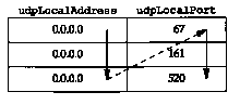 This implies that the system is willing to receive UDP datagrams on any interface for ports 67 (BOOTP server), 161 (SNMP), and 520 (RIP). The three rows in the table are referenced as shown in Figure 25.12.