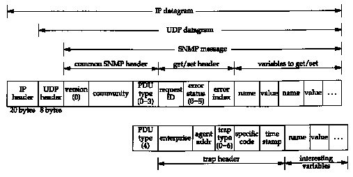 In this figure we specify the size in bytes of the IP and UDP headers only. This is because the encoding used for the SNMP message-called ASN.1 and BER, which we describe later in this chapter-varies depending on the type of variable and its value.