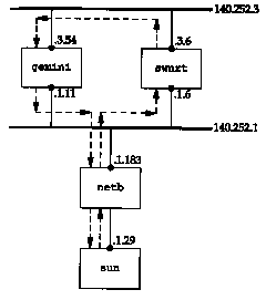 Figure 25.29 shows the arrangement of the systems. We can tell from the traceroute output that the host gemini and the router swnrt are both connected to two networks: 140.252.1 and 140.252.3.