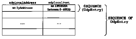 For example, the UDP listener table is named udpTable and it is a SEQUENCE OF the 2-element SEQUENCE (structure) UdpEntry that we just described. Figure 25.5 shows this two-dimensional array.