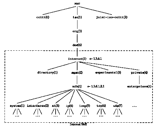 An object identifier is a sequence of integers separated by decimal points. These integers traverse a tree structure, similar to the DNS (Figure 14.1) or a Unix filesystem. There is an unnamed root at the top of the tree where the object identifiers start. (This is the same direction of tree traversal that's used with a Unix filesystem.)