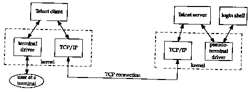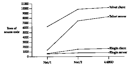 It is interesting to compare the complexity of Telnet and Rlogin by looking at the number of lines of source code required to implement the client and server for each. Figure 26.2 shows these counts for the standard Telnet and Rlogin client and server, as distributed in different versions from Berkeley (Figure 1.10).