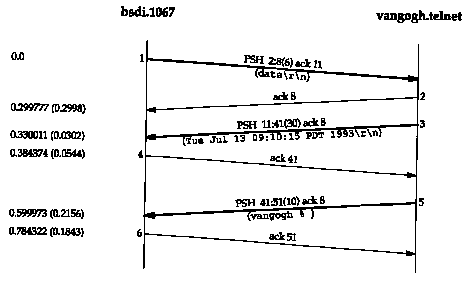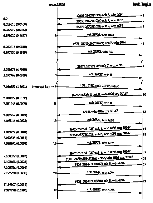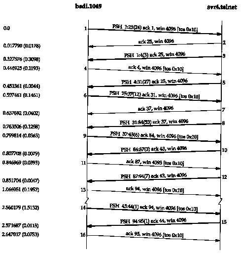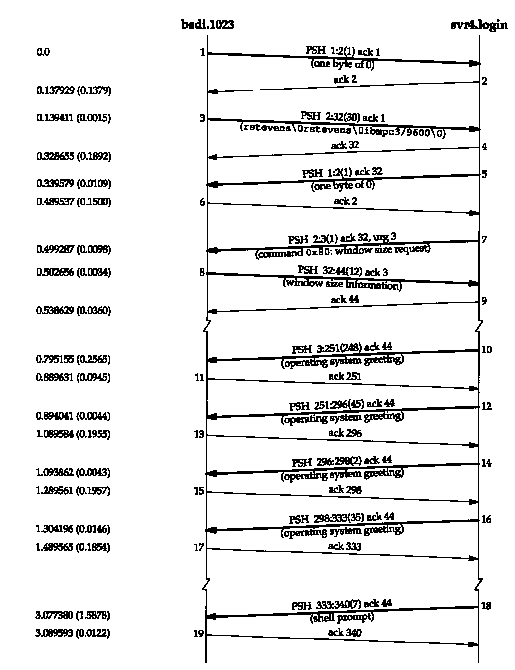 Figure 26.5 shows the time line for an Rlogin connection from the host bsdi to the server on svr4. (We have removed the normal TCP connection establishment, the window advertisements, and the type-of-service information.)