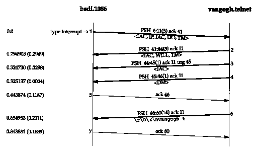 Let's see what Telnet does when the client types the interrupt key. We establish a session between the client bsdi and the server vangogh.cs.berkeley.edu. Figure 26.17 shows the time line when the interrupt key is typed. (We have removed the window advertisements and the type-of-service.)