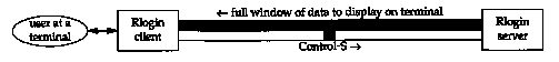 If this isn't done, each time we type Control-S to stop the terminal output, the Control-S character is sent across the network to the server, and the server stops writing to the network-but up to a window's worth of output may have been already written by the server and will be displayed before the output is stopped. Hundreds or thousands of bytes of data will scroll down the screen before the output stops. Figure 26.3 shows this scenario.